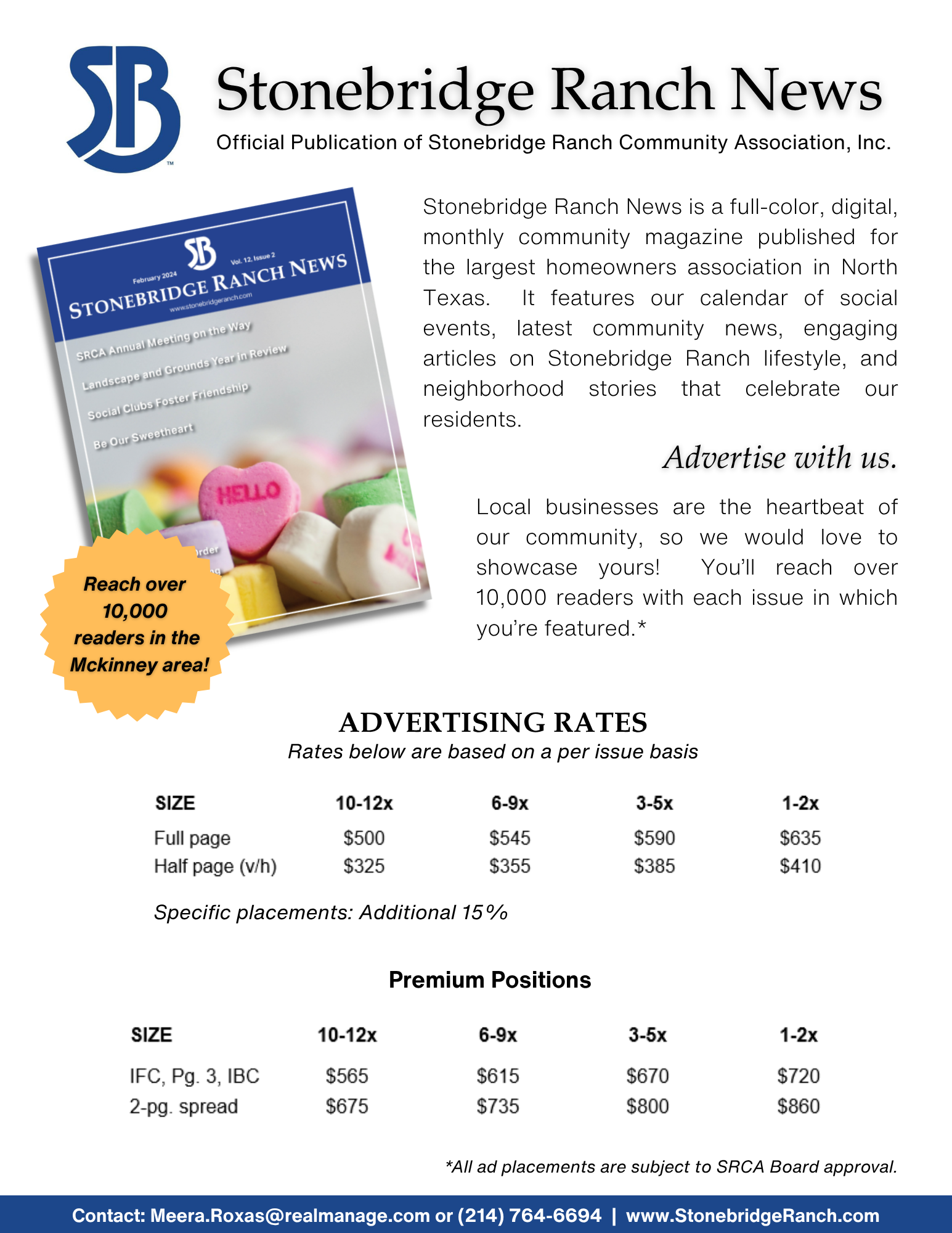 Stonebridge Ranch News is a full-color digital magazine delivered monthly to North Texas’ largest homeowners association, featuring events, community updates, and lifestyle content. Local businesses are the heartbeat of our community, so we would love to showcase yours! You’ll reach over 10,000 readers with each issue in which you’re featured.